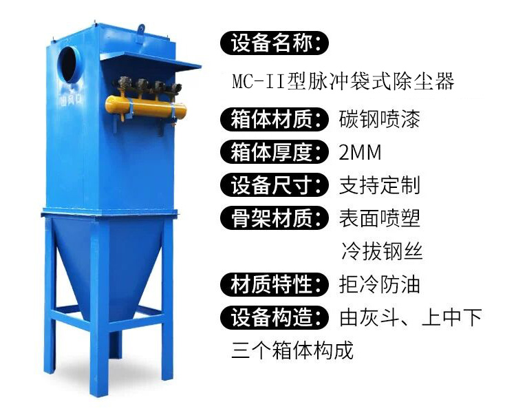MC-II型脈沖袋式除塵器是古瑞得昌廠家在MC—Ⅰ型的基礎上,改進的新型脈沖袋式除塵器。為了進一步提高脈沖袋式除塵器性能,將原有進行了修改,改后的MC—Ⅱ型脈沖袋式除塵器保留了MC—Ⅰ型的凈化,處體能力大,性能穩定,操作方便、濾袋壽命長、維修工作量小等優點。而且從結構上和脈沖閥上進行改革,解決了露天安放和壓縮空氣壓力低的問題。